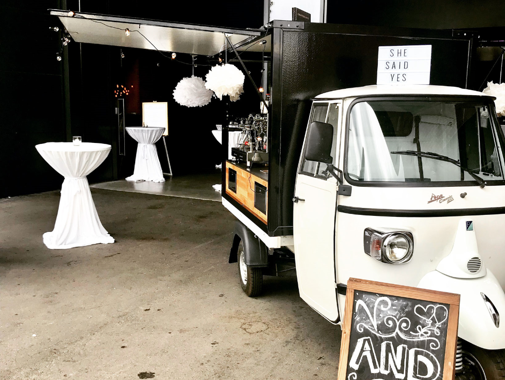 Neben dem Sektempfang bieten wir auch Kaffespezialitäten, zubereitet unter Hochdruck nach original italienischem Ursprung, aus unserer Ape an. Erfahren Sie den reinen und köstlichen Kaffee-Geschmack!